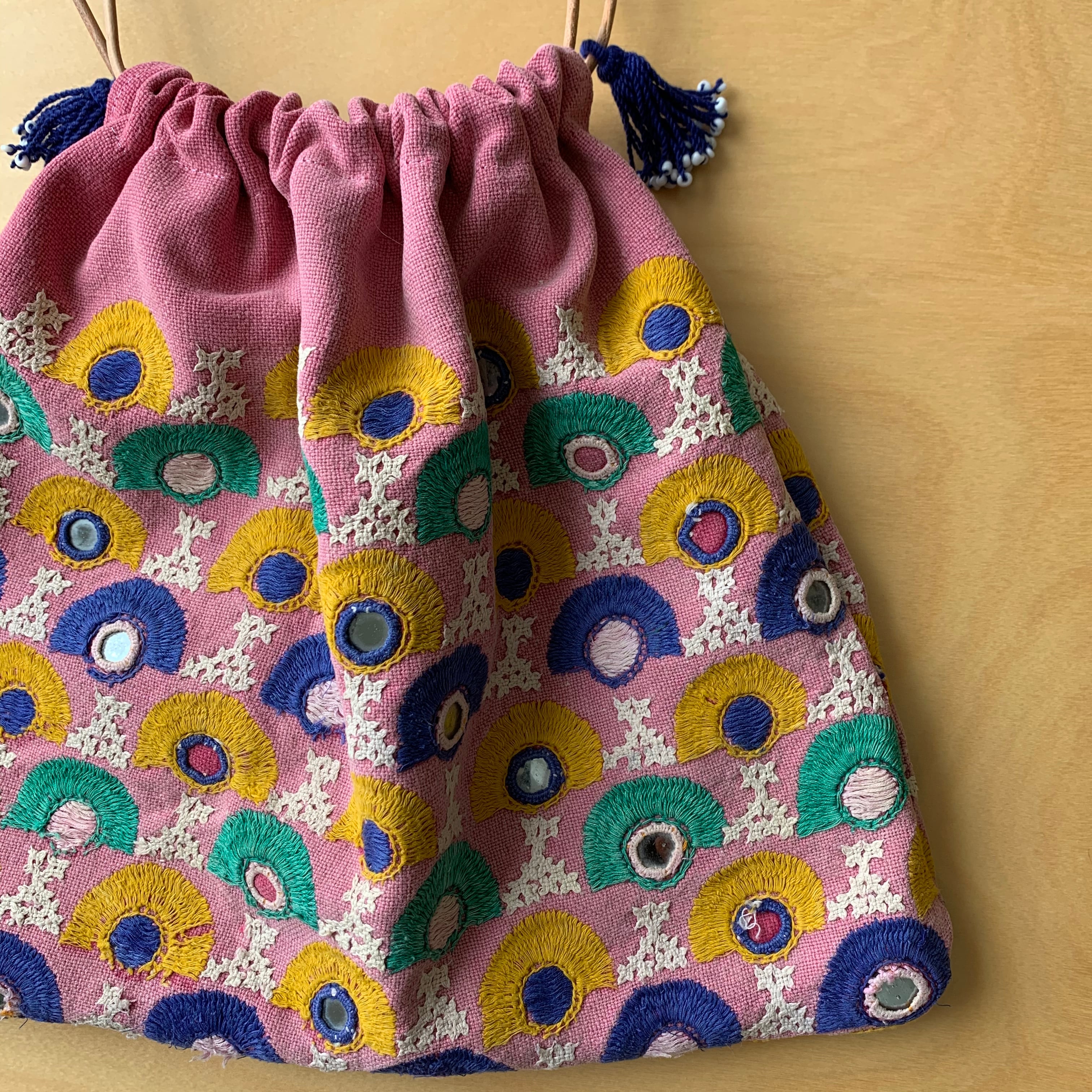 西インド、グジャラート地方に居住するラバリ族の刺繍布を使ってハンドメイドで作成した巾着バッグ。